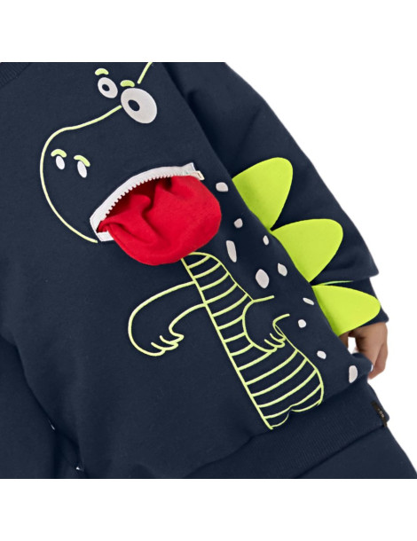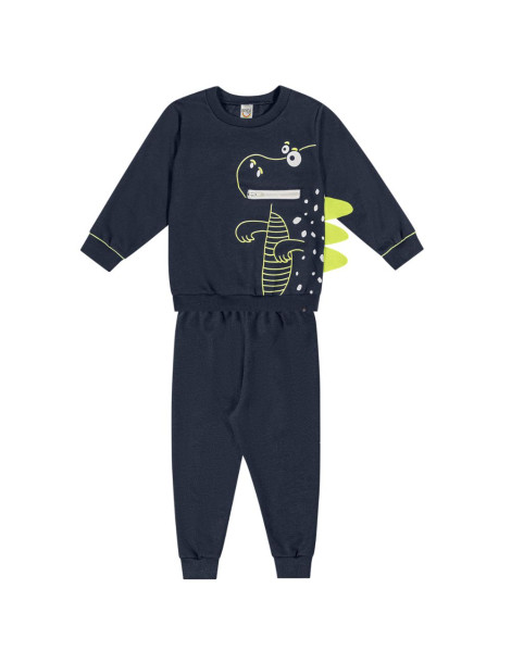 Conjuntos são práticos e não podem faltar no guarda-roupa! A estampa de dinossauro continua conquistando os pequenos aventureiros com sua capacidade de transportar as crianças para um mundo pré-histórico cheio de mistérios e emoções. E pode ser encontrada em peças interativas desta coleção! Conjunto composto por Blusão e Calça em Moletom peluciado na cor Azul Marinho. O Blusão em moletom peluciado, manga longa. Destaque para estampa localizada em cores neon, de dinossauro com a boca em zíper interativo como bolso funcional. O bolso frontal abre e pode-se tirar uma língua do dino para fora. Conta ainda com divertidas escamas na cor verde neon, aplicadas na lateral do blusão. Possuí ainda, ribana nos punhos e decote, e acabamento em viés verde neon nos punhos. A Calça em moletom peluciado por dentro, super macia, cor Azul Marinho, possuí elástico largo no cós para maior conforto ao vestir e barra em ribana. REF 19103