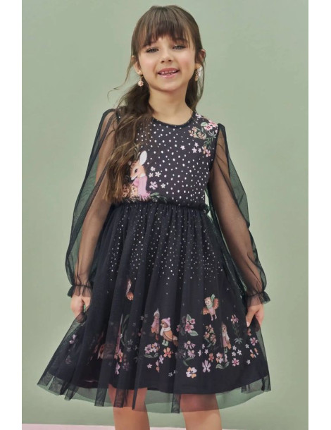 Possui estampa rotativa Bucólica, de Poá, Flores, folhagens, animais da floresta e delicadas fadinhas Rena em toda a peça e charmosa sobreposição da saia em Tule, com franzido na cintura. REF. 79584