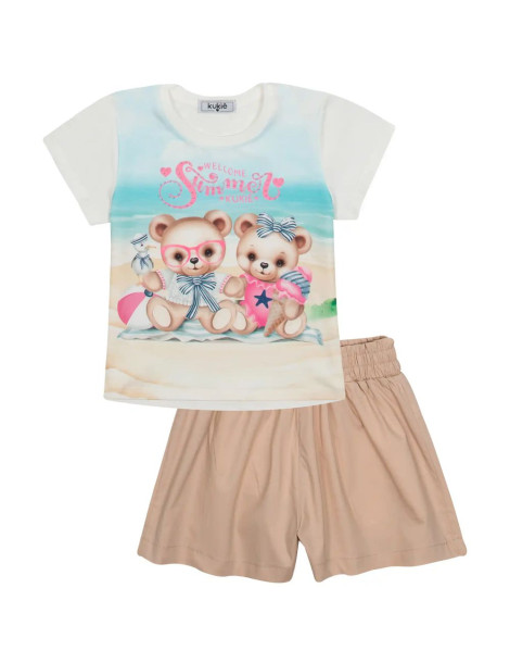 Modelagem estilo bata, alongada nas costas e barra arredonda. Destaque para linda estampa de ursinhas na praia e cores areia e turquesa, com frase “WELCOME SUMMER KUKIÊ” (bem-vindo verão) e apliques de strass na frase. Shorts em tricoline, cor bege escuro, modelagem evasê, franzidinho, cós super largo com elástico para maior conforto ao vestir e forro em poliéster macio. Feito com materiais de alta qualidade, o conjunto proporciona liberdade de movimento, permitindo que as crianças brinquem e se divirtam sem restrições.