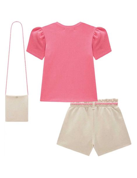 Aposte neste Conjunto Infantil, Blusa Canelada, decote redondo em debrum, confeccionada em Malha Canelada Liz, na cor Rosa Chiclete, manga curta, estilo princesa. Destaque para aplique frontal de strass em formato ursinho. Shorts-Saia em Moletom Rústico, com aspecto linho, na cor bege, confeccionado de a partir de fibras Recicladas.
